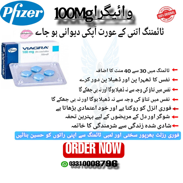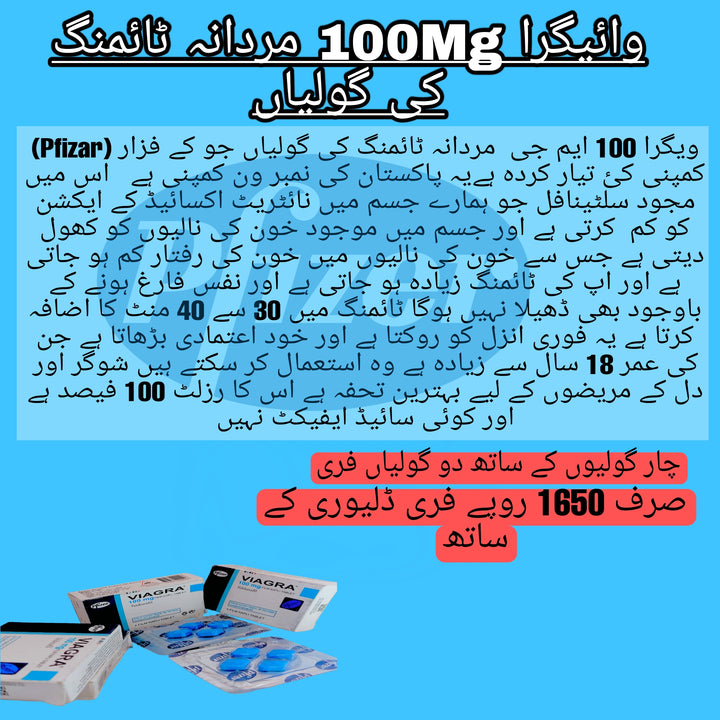 ویگرا 100 ایم جی مردانہ ٹائمنگ کی گولیاں جو کے فزار (Pfizar) کمپنی کئ تیار کردہ ہےیہ پاکستان کی نمبر ون کمپنی ہے اس میں مجود سلٹینافل جو ہمارے جسم میں نائٹریٹ اکسائیڈ کے ایکشن کو کم کرتی ہے اور جسم میں موجود خون کی نالیوں کو کھول دیتی ہے جس سے خون کی نالیوں میں خون کی رفتار کم ہو جاتی ہے اور اپ کی ٹائمنگ زیادہ ہو جاتی ہے اور نفس فارغ ہونے کے باوجود بھی ڈھیلا نہیں ہوگا ٹائمنگ میں 30 سے 40 منٹ کا اضافہ کرتا ہے یہ فوری انزل کو روکتا ہے اور خود اعتمادی بڑھاتا ہے جن کی عمر 18 سال سے زیادہ ہے وہ استعمال کر سکتے ہیں شوگر اور دل کے مریضوں کے لیے بہترین تحفہ ہے اس کا رزلٹ 100 فیصد ہے اور کوئی سائیڈ ایفیکٹ نہیں.شادی شدہ زندگی سے شرمندگی کا خاتمہ پارسل مکمل رضاداری کے ساتھ ارسال کیا جائے گا